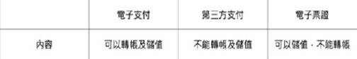 非現金支付是趨勢,像是行動錢包(悠遊卡、一卡通等)就已打入消費者(特別是台北都會區)的生活。或許有人對於一些非現金支付的名詞不是很清楚,下表將電子支付、第三方支付、電子票證(電子錢包)的特性做一個說明,除了台灣消費者比較熟悉的電子票證外,從大陸「紅」到台灣的第三方支付(如大陸的支付寶、台灣的夠麻吉等),還有「正宗」的電子支付(如ezPay、歐付寶等),三者的功用都不一樣,而電子支付能做的事情則是最多,若說要完全取代現有的金融交易,電子支付的影響會是最大的,而悠遊卡等電子票證普及也影響了電子支付的發展, 回說APPLE PAY和LINE PAY,都是行動支付的一種,而是把手持的信用卡整合到行動載具APP中。